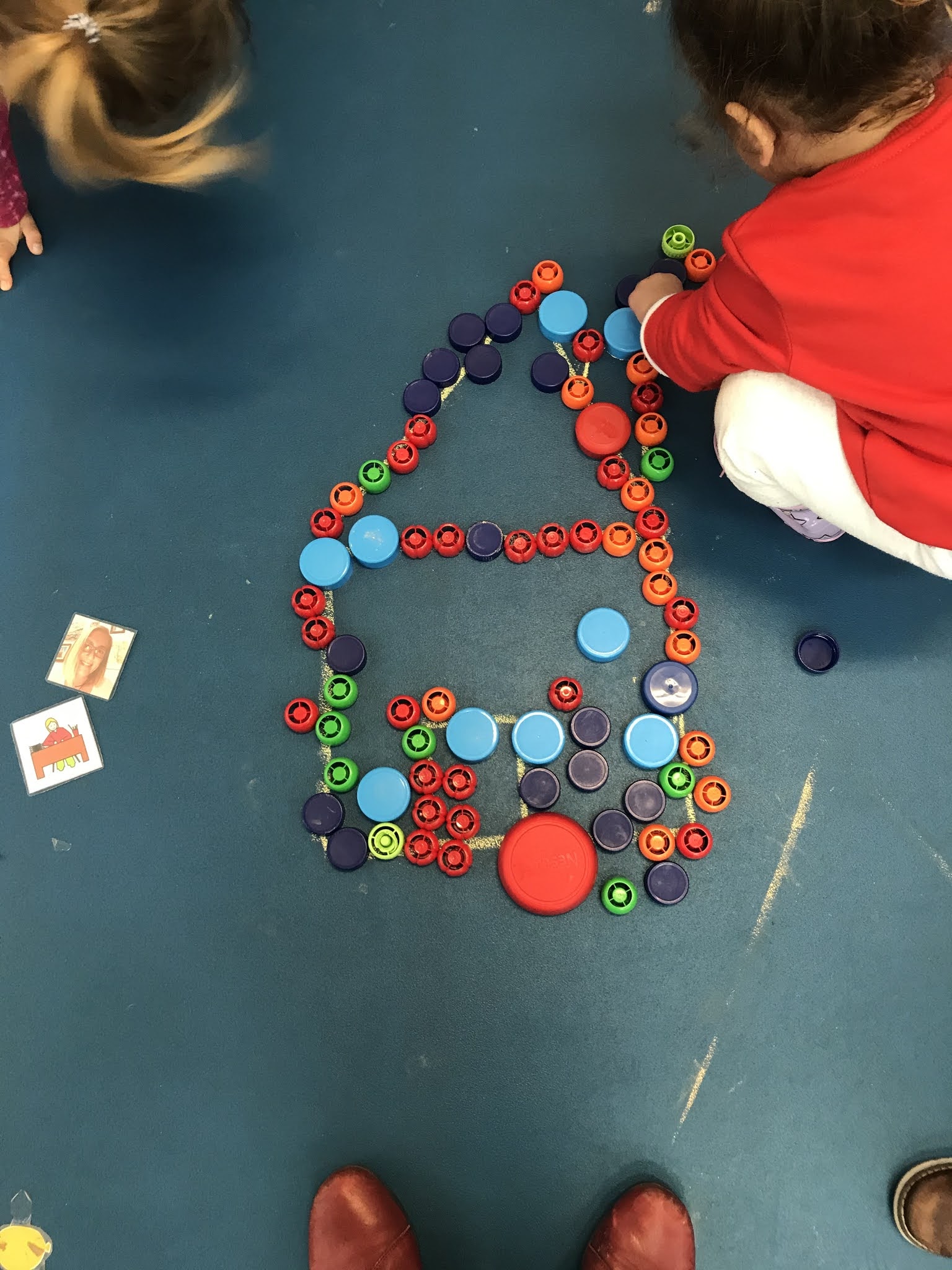 En el rincón de las construcciones hay que hacer dibujos y formas con los tapones,